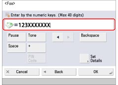 Press [Set Details] to set the subaddress, password, ECM TX, Sending Speed, and Long Distance. If the machine is set to use multiple lines, you can also select the line to use when sending.