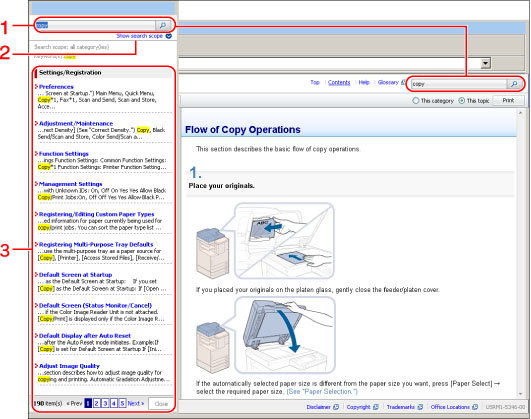 Enter a keyword in the entry field which is located on the upper right of the "Top" or "Topic page," and then click to display the search dialog box.You can also search by entering a keyword in the displayed dialog box. In addition, the AND search is available in the e-Manual so you can refine the search results by entering two or more keywords. When entering keywords, enter a space between the keywords. Example: "Toner Message" (if you want to display pages which include words, "Toner" and "Message") |
