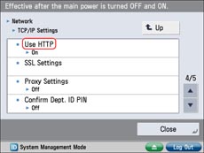 The setting for [Use HTTP] and [Use SSL] is activated only after you restart the machine (the main power switch is turned OFF, and then back ON). For instructions on turning the power ON/OFF, see "Main Power and Control Panel Power."