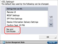 Press [SSL Settings] for [TCP/IP Settings] → [Key and Certificate].