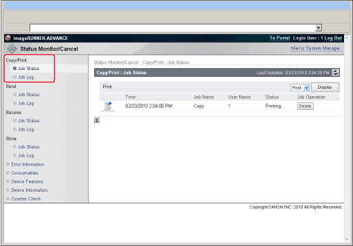 Displays the local print job log, including jobs from the Memory RX Inbox or Confidential Fax Inboxes.