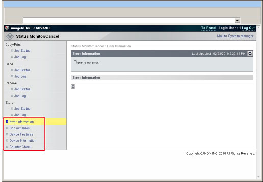 Displays information related to the machine, such as the system manager's information and the location where the machine is installed.