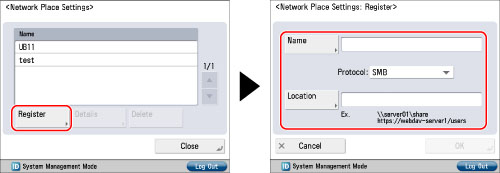 You can register the Advanced Space (Network Place) of another imageRUNNER ADVANCE series machine which is opened with SMB or WebDAV as an external storage location and share files in the Advanced Space.
