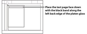 Place the test page face down on the platen glass, with the black bands along the top left back edge of the platen glass by the arrow.