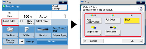 If your originals contain colour sections, the machine copies them in the Full Color mode. However, the machine may copy colour originals in the Black mode under the following conditions. To avoid this, manually set the colour mode to [Full Color].