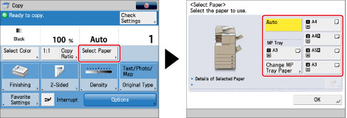 Icons indicating the type of paper loaded in each paper drawer can be displayed on paper selection screens, if you store that information into the machine beforehand. (See "Registering/Editing Custom Paper Types.")