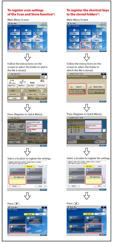 The Quick Menu is a function that increases the efficiency of operations that use functions of the machine for an office. You can create and register frequently used function settings such as Copy, Scan and Send, and Scan and Store in a button.