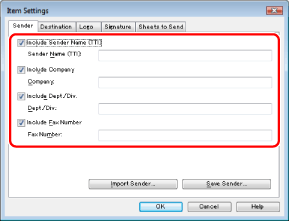 You can save the information entered in the [Sender] sheet in a file by clicking [Save Sender]. Then, when you send a fax, you can import the information by using [Import Sender], instead of entering the sender information each time you send a fax.