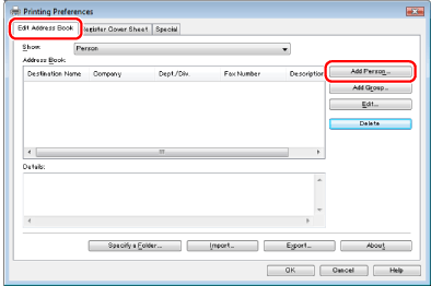 You can also edit previously registered single person addresses. For more information, click [Help] in the bottom right-hand corner of the fax driver window to view the online help.