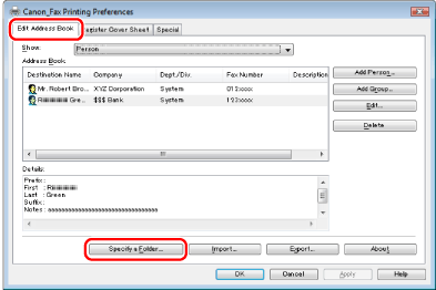 You cannot access or edit the address book if you do not have access permission (default: Power Users or higher) to the destination folder of the address book. If this is the case, log on as a user having access permission to the folder, or click [Specify a Folder] in the [Edit Address Book] sheet, and specify a folder, such as the [My Documents] folder, that you have write permission for as the destination folder of the address book.