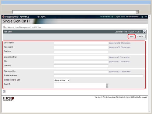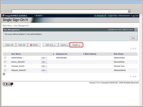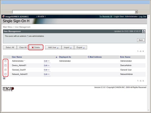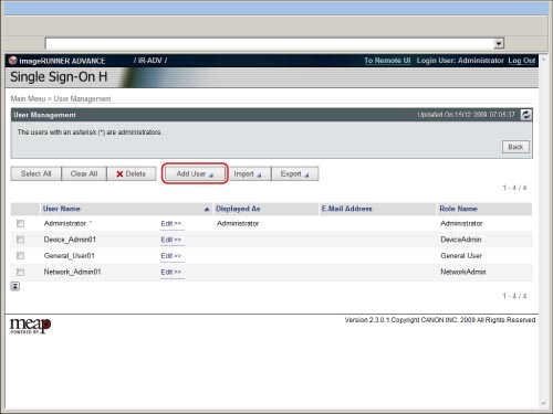Only the Local Device Authentication administrator can register/edit user data on the [User Management] page. Regular users can only change their own password.