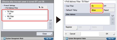 Press [TX Filter] or [RX Filter] for [IPv6 Address Filter] → set <Use Filter> to 'Off'.