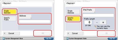 Press [Register] → set the IPv6 address or IPv6 address prefix for which data transmission/reception is to be allowed → press [OK].