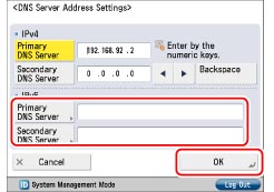 Press [DNS Server Address Settings] for [DNS Settings] → specify the following items in <IPv6> → press [OK].