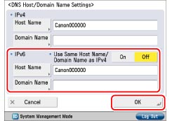 If you set <Use Same Host Name/Domain Name as IPv4> to 'Off', press [Host Name] → enter the name of the machine → press [OK]. Press [Domain Name] → enter the name of the network domain the machine belongs to → press [OK].