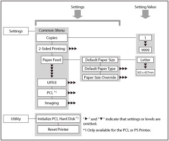 The Printer Settings menu enables you to access common features. Below is an abbreviated outline of the Printer Settings menu structure.