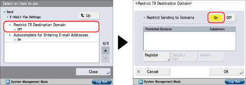 Press [Restrict TX Destination Domain] → [On] for <Restrict Sending to Domains>.