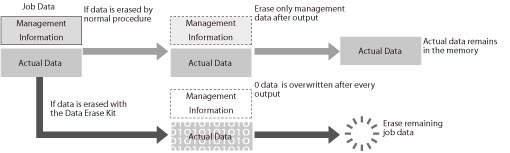 The machine separates and stores the job data when copying, sending, receiving, and printing into management information and actual data. The management information is automatically erased when the job is complete, but the actual data is stored in the memory.