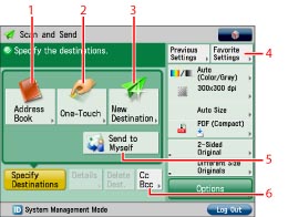 If you set an address type to 'On' in [Limit New Destination], you cannot enter new destinations of that type. Select a stored destination by using the Local Address Book, Remote Address Book, LDAP Server in [Address Book], or pressing a one touch button in [One-Touch]. (See "Restricting Sending to New Addresses.")
