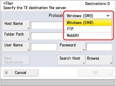 If you select [FTP] or [WebDAV] as the server protocol, you can also specify a port number after the host name address by entering a colon (:) and the port number.