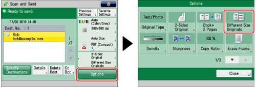 Specify the destination → press [Options] → [Different Size Originals].