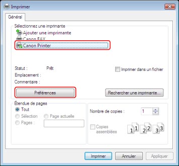 Dans la boîte de dialogue [Imprimer], cliquer sur [Préférences].
