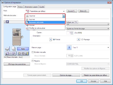 Dans la feuille [Configuration page], dérouler la liste <Méthode de sortie> → sélectionner [Impression sécurisée].