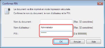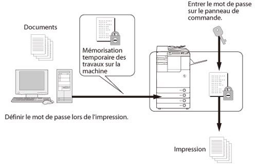 Il convient de saisir de nouveau le mot de passe pour imprimer à partir de la machine. Une fois le mot de passe défini pour le document, le consigner et le conserver en lieu sûr.
