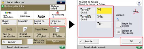 Appuyer sur [Format de fichier] → sélectionner le format de fichier → appuyer sur [OK].