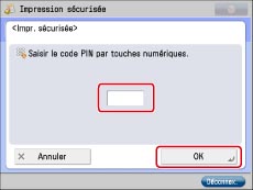 Lors de l'impression d'un document sécurisé, entrer le mot de passe initialement attribué au document par le biais du pilote d'imprimante. Si une tâche d'impression est en cours ou réservée, elle est mise en file d'attente.