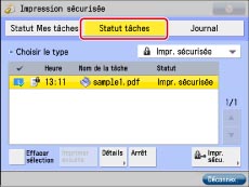 Permet d'annuler la tâche sélectionnée. Appuyer sur [Arrêt] → [Oui] pour annuler la tâche.