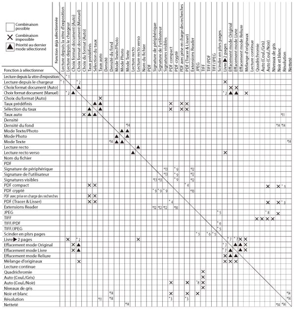 Ces tableaux indiquent les combinaisons de réglages possibles lorsque plusieurs fonctions doivent être définies à la fois.
