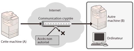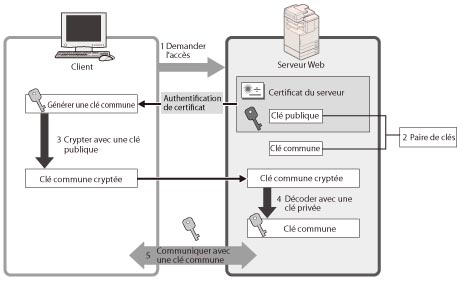 Il est possible de disposer d'une communication cryptée sûre lorsque l'utilisateur accède à la machine via un navigateur Web en installant un certificat de serveur sur la machine. Avec les communications SSL, la clé commune qui peut uniquement être utilisée par l'utilisateur et la machine est générée à l'aide du certificat de serveur et de la clé publique. Il est ainsi possible d'éviter l'interception et le vol de données. Voir
