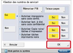 Définir <Autoriser tâches imprimante noire> sur "Non" pour refuser les tâches d'impression en noir et blanc provenant de pilotes d'imprimante qui ne prennent pas en charge la gestion des numéros de service.