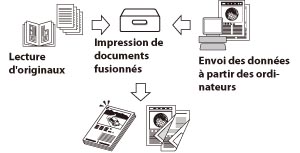 Il est possible de convertir les données de documents lus aux formats de fichiers PDF, JPEG et TIFF, accessibles à partir de l'ordinateur, et d'enregistrer les données sur un réseau ou un emplacement de support mémoire. Les fichiers enregistrés peuvent également être imprimés à partir de la machine.