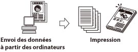 Cette machine peut être utilisée comme une imprimante réseau à grande vitesse. Différents modes d'impression sont disponibles, tels que l'impression recto verso et l'alignement des pages. Si le Kit d'impression PS est activé, il est possible d'utiliser cette machine comme imprimante PostScript avec le logiciel Adobe PostScript3.