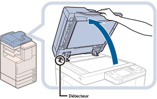 Sur cette machine, le chargeur/cache d'exposition est équipé d'un détecteur d'ouverture/fermeture (encerclé dans l'illustration ci-dessus). Pour déposer les originaux sur la vitre d'exposition, soulever le chargeur/cache d'exposition d'environ 300 mm de manière à en écarter le détecteur. Si le détecteur ne s'écarte pas, le format des originaux risque de ne pas être détecté correctement.
