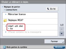 Appuyer sur [Réglages de gestion]→ [Licence/Autre] → [Interf. util. dist.].
