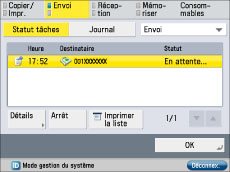 Si [Envoi], [Statut tâches] et [Envoi] sont définis comme Ecran par défaut (Suivi du statut/Annul.) :