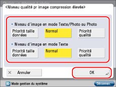 Le réglage du niveau de qualité d'image est activé si on utilise le mode sélectionné comme Type d'original dans [Copie], [Accès fich. enregistrés]. Toutefois, si le format de fichier [PDF (Tracer&Lisser)] et le type d'original mode Texte sont sélectionnés, ce réglage n'est pas valide.