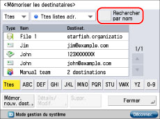Si l'option [Ttes listes adr.] de la liste déroulante Carnet d'adresses est sélectionnée, les destinataires mémorisés dans les boutons de composition 1 touche sont également affichés. Il est toutefois impossible de modifier les destinataires enregistrés dans les boutons de composition 1 touche. Pour plus d'informations sur la mémorisation/modification des boutons de composition 1 touche, voir