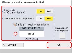 Sélectionner [Oui] pour que le Rapport de gestion des communications s'imprime automatiquement lorsque le nombre de transmissions (envoi et réception) atteint 100.