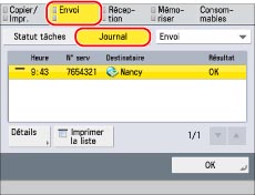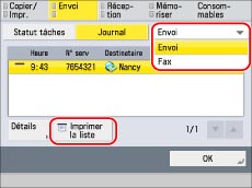 Pour imprimer l'historique des opérations d'envoi correspondant au Rapport de télécopie, sélectionner [Fax] dans la liste déroulante. (Voir "Rapport de télécopie".)