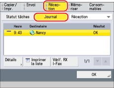 Pour imprimer l'historique des opérations de réception correspondant au Rapport de télécopie, sélectionner [Fax] dans la liste déroulante. (Voir "Rapport de télécopie".)