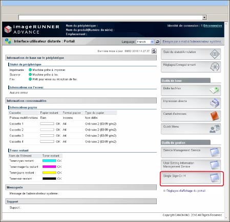 Si l'adresse <http://<adresse IP ou nom d'hôte de la machine>:8000/sso/> a été saisie, la page [Management Application] s'affiche sans qu'il ne soit nécessaire d'effectuer l'étape 4 (sans afficher l'écran de l'interface utilisateur distante).