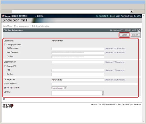 Seul l'administrateur Local Device Authentication peut mémoriser/modifier les données utilisateur dans la page [User Management]. Les utilisateurs réguliers peuvent seulement modifier leur propre mot de passe.