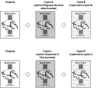 Le mode [Filigrane sécurisé] permet d'intégrer du texte dans le fond des copies.