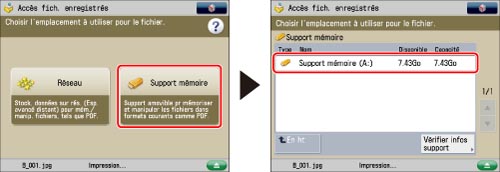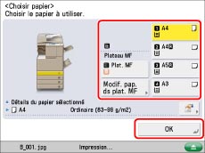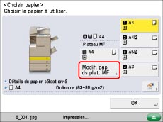 Si l'option [Mémoriser régl. par défaut plat. multifctns] est réglée sur "Oui" dans les réglages d'utilisation du périphérique, et que les format et type de papier ont été mémorisés, ces informations sont affichées à l'écran pour le papier sélectionné. (Voir "Mémorisation des réglages par défaut du plateau multifonctions".)
