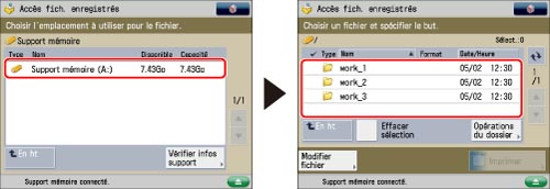 .Si l'option [Mémoriser régl. par défaut plat. multifctns] est réglée sur "Oui" dans les réglages d'utilisation du périphérique, et que les format et type de papier ont été mémorisés, ces informations sont affichées à l'écran pour le papier sélectionné. (Voir "Mémorisation des réglages par défaut du plateau multifonctions".)