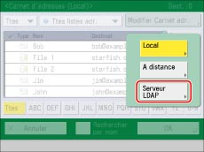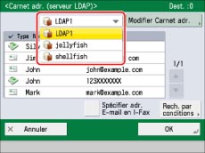Si plusieurs serveurs LDAP sont mémorisés et que [Rech. auto si utilisation serveur LDAP] est activé dans [Définir destinataire] (Réglages/Enregistrement), la recherche est effectuée sur le premier serveur mémorisé de la liste déroulante.